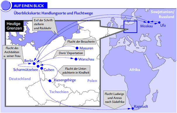 Eine Vielzahl von Schaubildern und Kurzzusammenfassungen erleichtert dabei das Verständnis des Werks und hilft beim Lernen – das folgende Schaubild zum Beispiel vermittelt auf einen Blick die Handlungsorte des Romans und die Fluchtwege der Figuren.