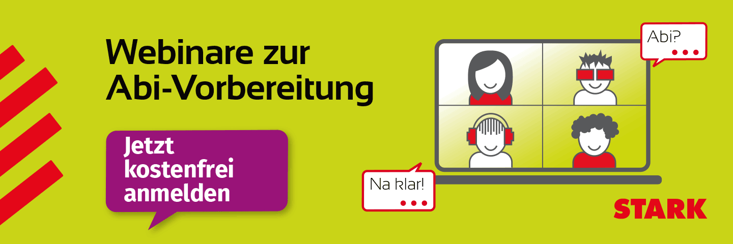 Kostenlose Webinare zur Abi-Vorbereitung Mit STARK erfolgreich durch die Abiturprüfungen : Im Jahr 2025 fanden Webinare in den Fächern Mathematik, Deutsch und Englisch statt – zur gezielten Vorbereitung auf das Abitur. Erfahrene Lehrkräfte behandelten abiturrelevante Themen und gaben praxisnahe Tipps zur Prüfungsvorbereitung.